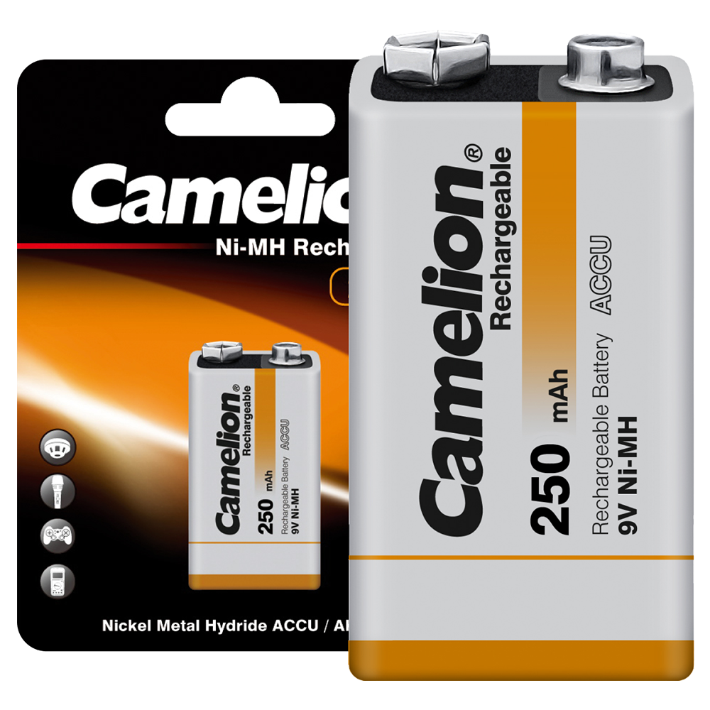 Аккумулятор Camelion NH-9V250BP1, напряжение 9В, емкость 250мА*ч, кол-во в упаковке 1 шт., размер упаковки 90x117x18 мм, использовать при температуре от - 20 до + 40 °C