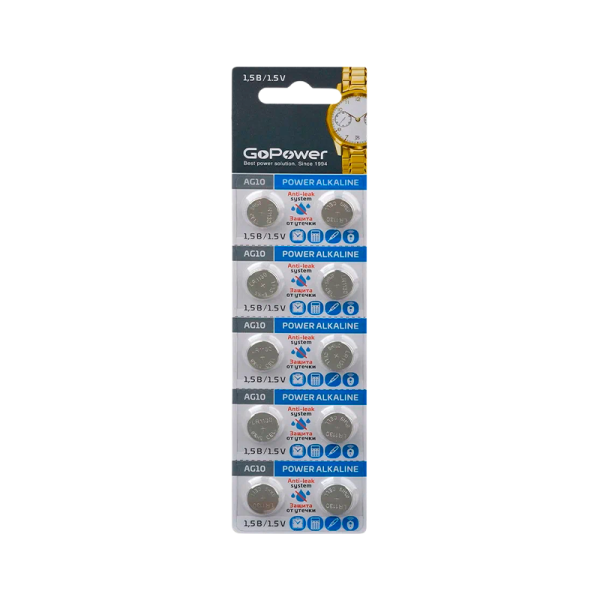 Батарейка GoPower G10/LR1130/LR54/389A/189 BL10 Alkaline 1.5V (10/100/3600) (блистер 10шт)