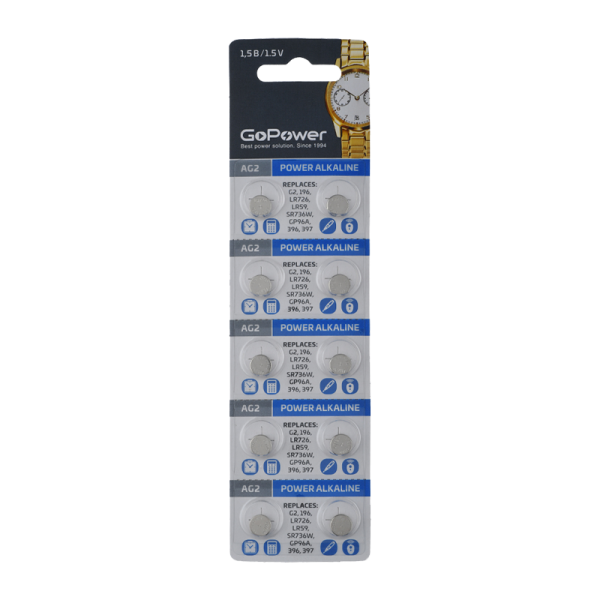 Батарейка GoPower G2/LR726/LR59/396A/196 BL10 Alkaline 1.55V (10/100/1000/3600)(блистер 10шт)
