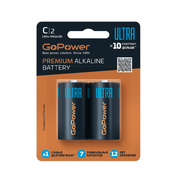 Батарейка GoPower ULTRA LR14 C BL2 Alkaline 1.5V (2/12/192)(блистер 2шт)
